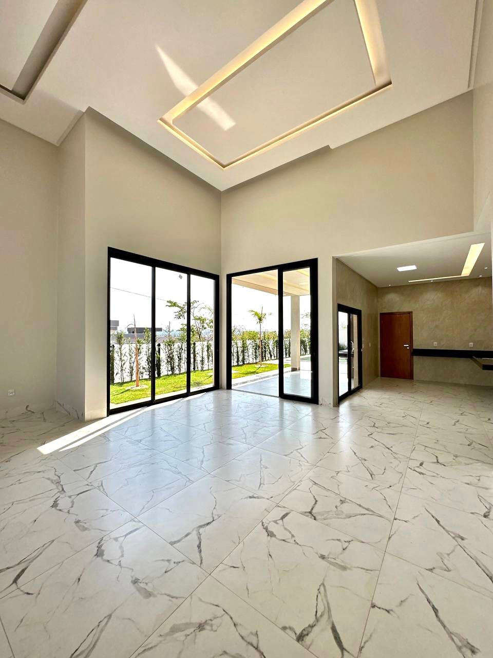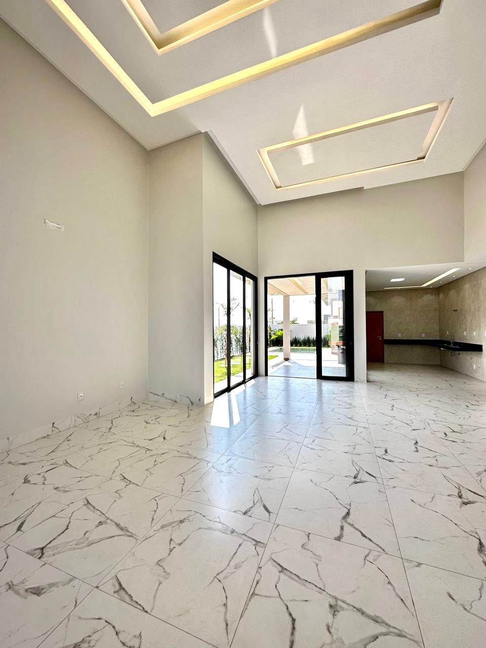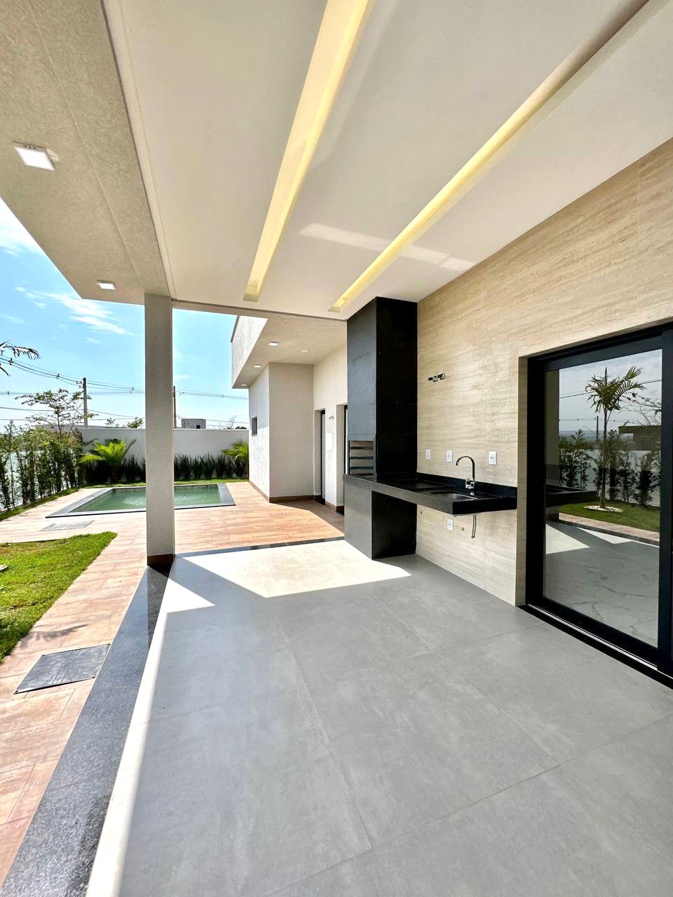 Temos um amplo living com pé direito duplo e total integração, cozinha, espaço gourmet com churrasqueira a carvão, piscina aquecida e paisagismo completo ao redor.
