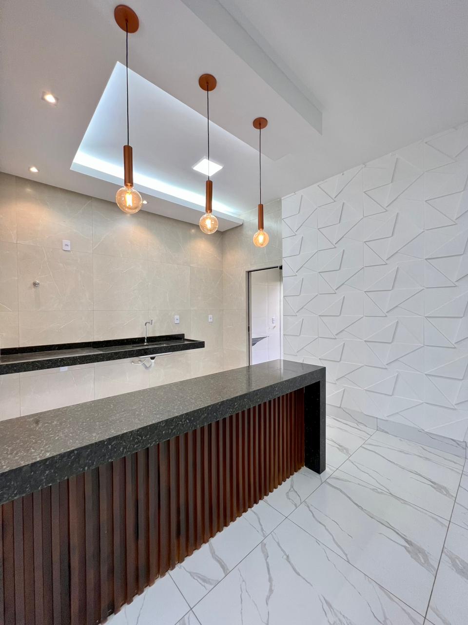 Temos uma ampla sala de estar e jantar com total integração, grande cozinha com balcão em acabamento no ripado, espaço gourmet com churrasqueira a carvão, amplo quintal para elaborar o seu lazer da forma que preferir, dois banheiros com lavatório esculpido e nicho em mármore Bege Bahia.
